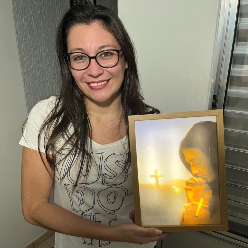 "Eu sempre procurei algo que trouxesse mais espiritualidade para o meu quarto, e o esse quadro foi a solução perfeita. Escolhi a imagem da moça orando em frente a cruz e não me arrependi. Cada vez que a luz se acende, sinto como se estivesse em um ambiente de paz e amor."